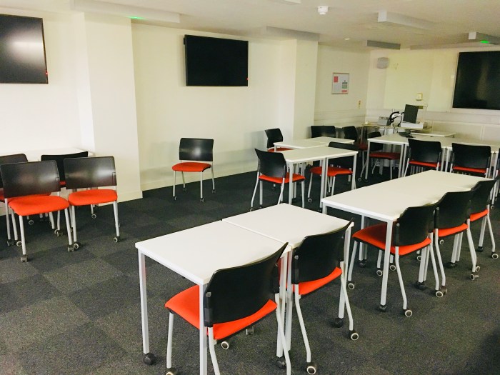 Another issue is that the room looks messy and cluttered, not particularly conducive nor engaging for learners. The tables are very small [60 cm square] for adults, they are square so not conducive to collaboration as each right-angle is a sharp corner. Far better to design learning spaces with versatility of use, rather than attempting to cater for numerous activities and not succeeding in any. By adopting the ‘portfolio’ approach; it is better to create a range of learning spaces that cater for different purposes in terms of cohort, activity and layout. This will arguably improve efficiency, such as utilisation as well as educational effectiveness, thus meeting Estates requirements as well as pedagogic imperatives.
