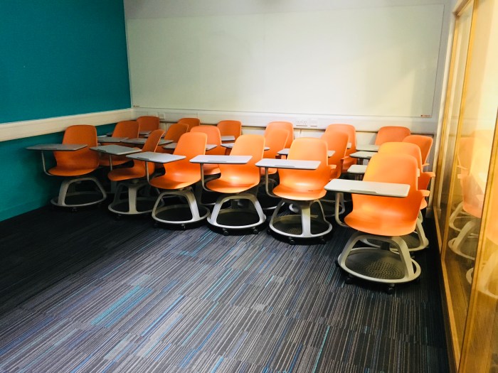 The F-word is my term for ‘flexible’, the main issue is the tables which can be moved as they are on castors but each table has a castor which is locked and would need to be freed in order fo the tables to be moved. This photograph is a good example of what in-coming classes would be faced with, as the previous class have left the furniture like this. Most classes are timetabled for less than an hour, so the academic would have little time to rearrange the furniture to suit. See the Learning Spaces Toolkit pages 13 & 80, UCISA/SCHOMS/AUDE, 2015.