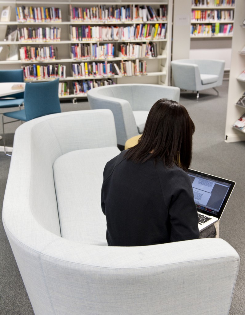The high-backed sofas create media pods which have become the most popular place to sit, students have asked if they can be booked. In fact only one is a true media pod as the Library were keen to see if the demand existed before investing in more LCD screens and connectivity modules for all three pods.