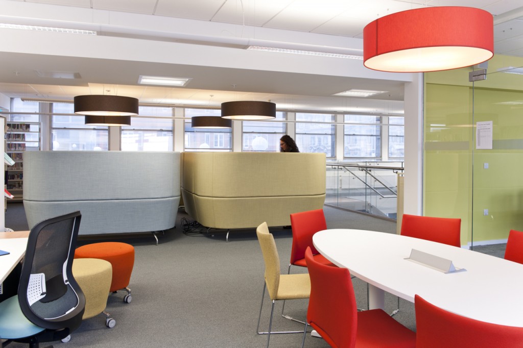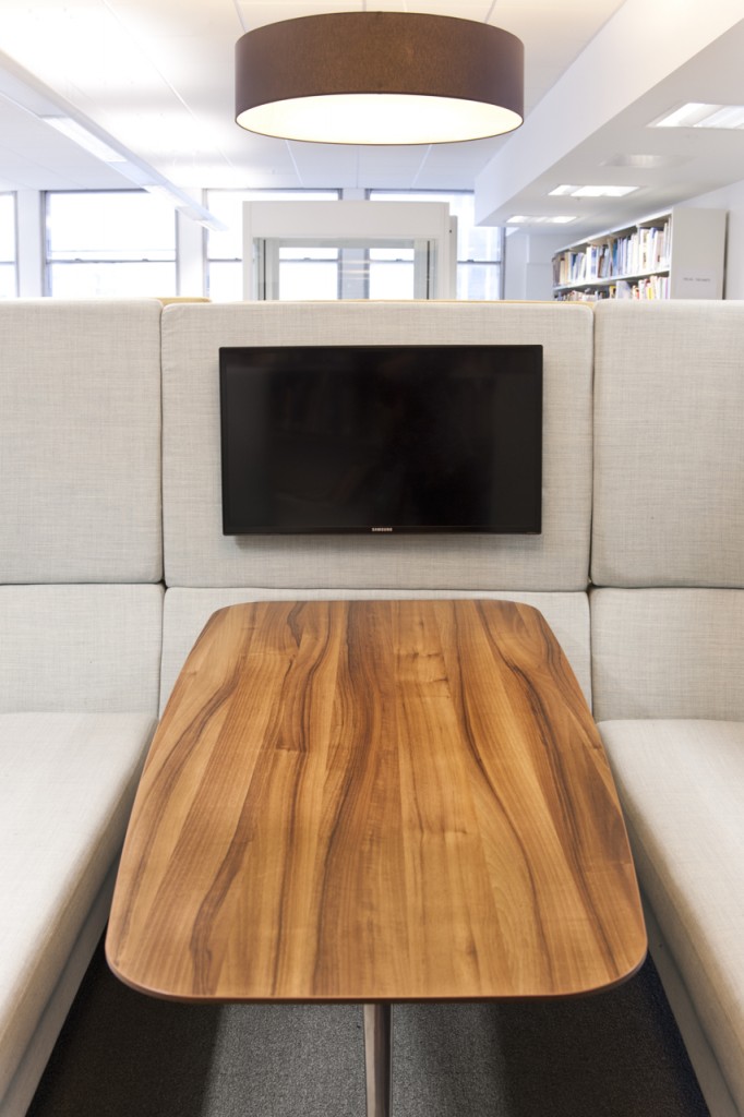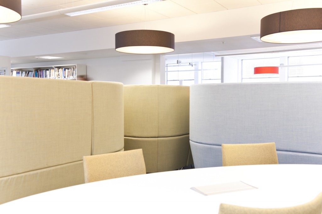 In the photograph shown below, the Library Service wanted an additional group study table as opposed to the original design for a fourth media pod/sofa alcove. The remaining media pods do create a screen for this table and are all very popular amongst users.