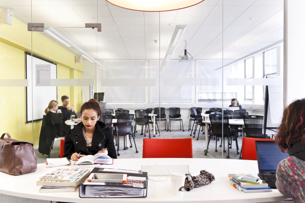 The Library redevelopment at John Princes Street was completed just in time and opened for the start of the new academic year despite an extremely short lead time for all concerned. Our designs and intentions have mostly been realised, it is satisfying to see students working in the space as though it was always there. There are now a variety of study zones for students to work as they choose; individually or collaboratively, quietly or conversationally in one of the media pods. So far the students say they love the space but with one main problem, and its not a new one, the Library is still not big enough to accommodate all those who want to work here. Importantly, the Library staff are happy with the refurbishment and feel they can now support students in a much improved space.