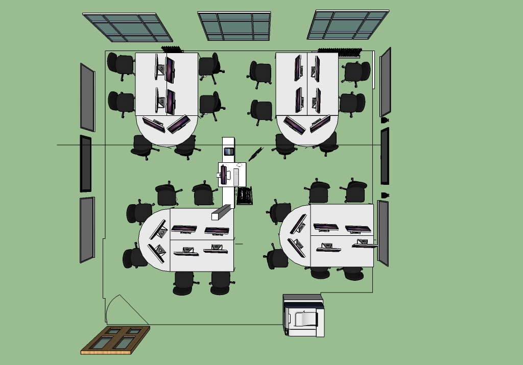 This is a camera view of the same room design. The design was agreed by all the stakeholders and represents an innovative approach into how classes will be taught, or better still, facilitated. The tutors’ position is central with their own iMac but with the expectation that they will be more mobile in their management of their class. Students will be able to work in groups on chairs that are mobile so that they can reposition themselves in order to work on their own computer, see one of the two large LCD screens or face the tutor wherever they are standing. The tutor will be able to move around the class, joining in with a group discussion, working with a particular student as well as being the fulcrum when addressing the whole cohort.