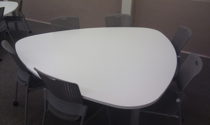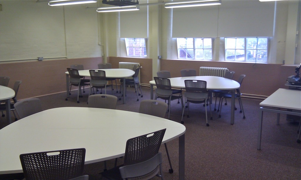 One of the key spatial design considerations was to incorporate the plectrum shape tables that have been used in a seminar room at our John Princes Street site. However these were to be of a larger size, each side would be 2m in width, to accommodate six students in total. The chairs would be the standard Cinto chair on castors from Humanscale. these inexpensive cantilevered and stack-able chair have proved to be very comfortable as well as meeting the college’s sustainability commitments to environmental procurement.