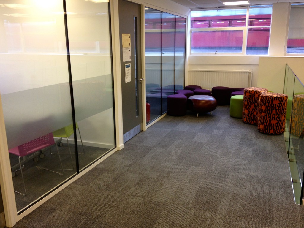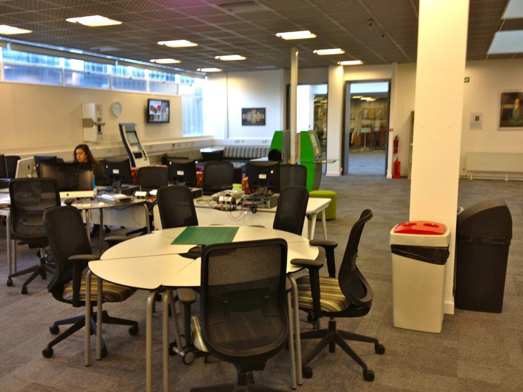However, LCC now has this informal study space for those students who choose not to work in the library or Digital Space. They have a good deal of space to spread themselves around and it is a big improvement from before. Although it does appear rather monochromatic in its atmosphere, there are splashes of colour from the Wagstaff furniture, reminiscent of other study spaces at Warwick and Sheffield.