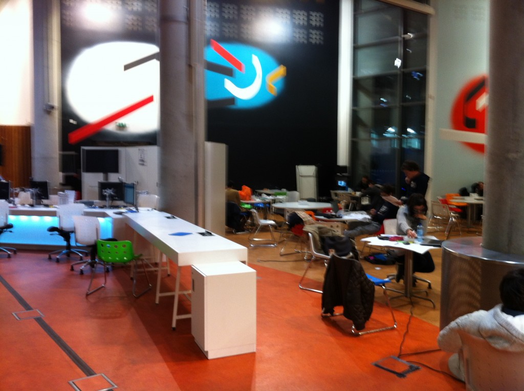 The lower ground floor felt rather like an airport terminal, brightly lit from above with a large data projector and screen mounted on the ground floor above.