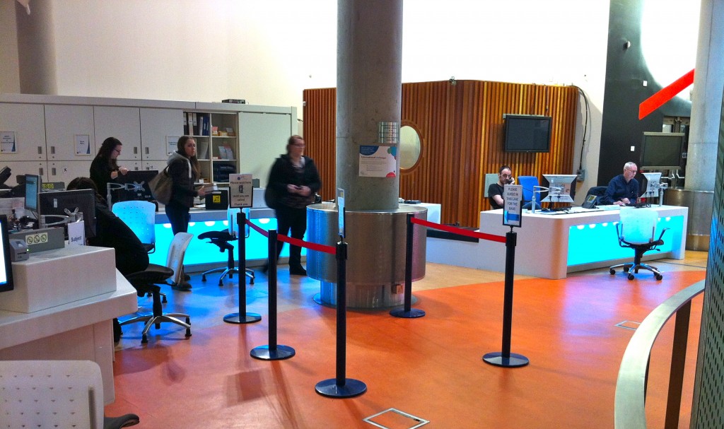 The architects placed the all-important helpdesk behind a large concrete column underneath the bridge with a gangway overhead so its not a good position and was done with no consultation.