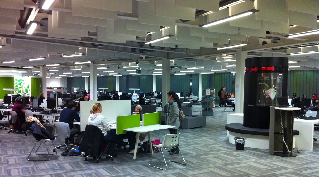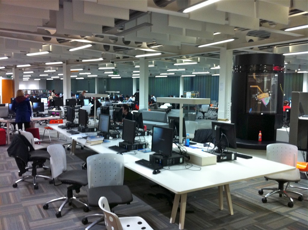 It was found that the large open plan floor plate was very challenging in that it is not very adaptable when they want to reconfigure for events, the ground floor is difficult with its fixed seats and floor boxes which are a nightmare. So they have bought study pod structures that the students.The lower ground floor is often used socially and it can get very noisy, so that staff members have trouble making themselves heard so they have given up on answering the telephone on floor. The Saltire Centre is open until 11 PM but a telephone helpline is available 24/7 for the library and IT support. They found that most students live nearby so they don’t need to be open 24 seven.