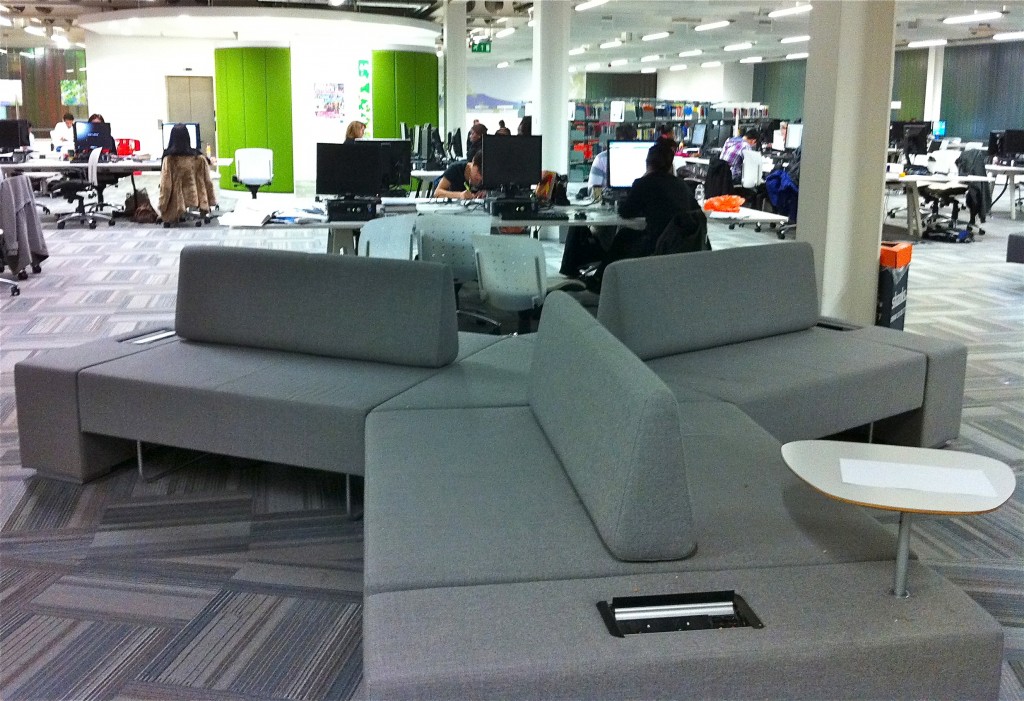 Soft seating has power modules on all floors, with some having writing tablets for laptop use. The furniture is varied at different heights and size and colour.