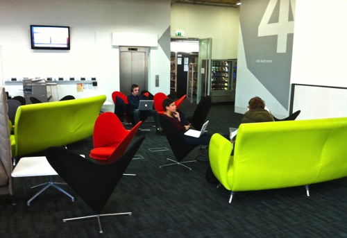 Ravensbourne is a university sector college specialising in digital media and design recently built next to the 02 in London, or the Dome as it used to be known. These are iPhone photos taken on 8th March during a technology day for my institution. Ravensbourne made a bold decision to embrace technology as much as possible, creating open and innovative study areas all over the building. There are no posters but wayfinding graphics and a network of digital signage. Technology is made available for all, in terms of laptop loans and bursaries for outright purchase.
