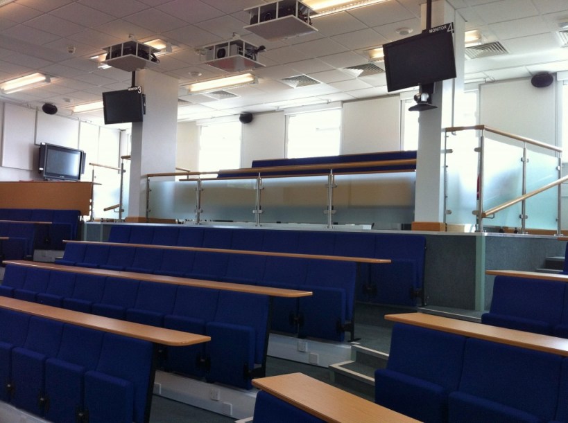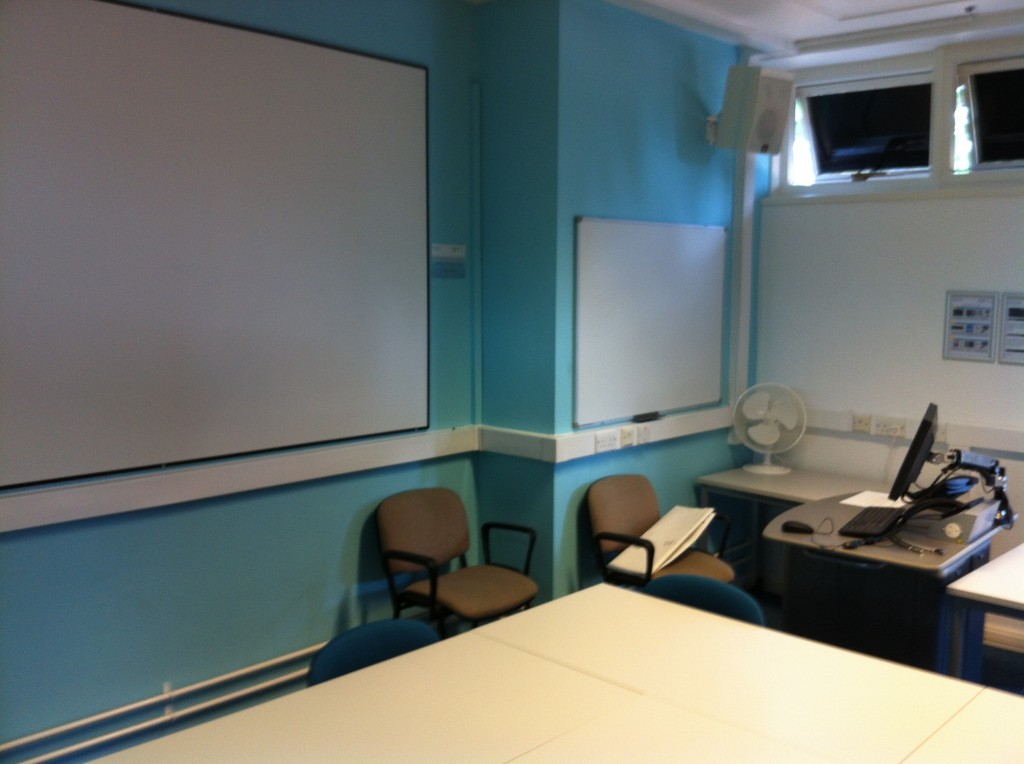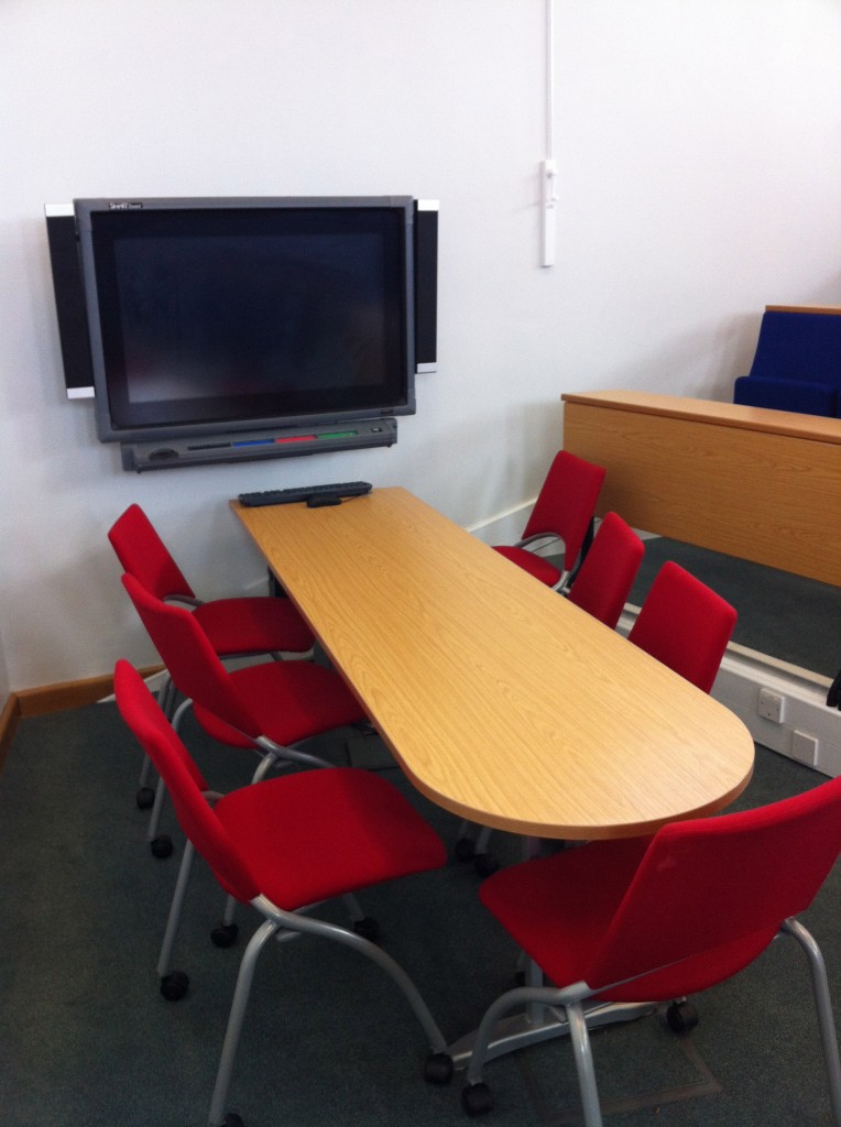 This elaborately equipped space has been modified and used as an experimental teaching room over recent years. It is able to host videoconferencing sessions, it has lecture capture facilities, group study areas, interactive technology, along with power and data for each student.