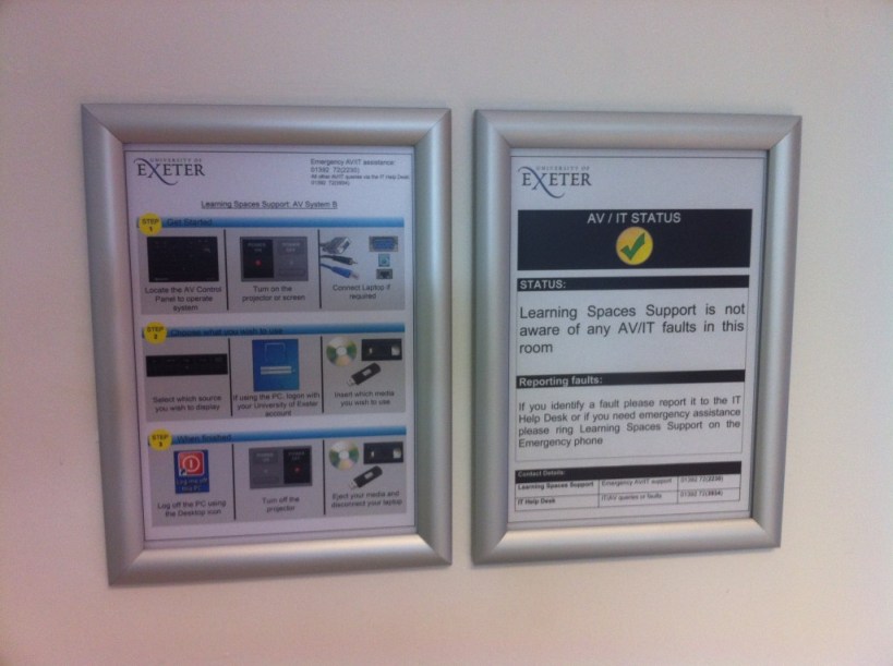 These final two images are taken from a typical seminar room, with a pleasing use of muted colour and extremely well designed signage for staff needing help with the technology. However, staff felt that the rooms were overspecified and that most tutors just needed a computer in each room connected to a large wall mounted LCD screen, so dispensing with lecterns and data projectors.