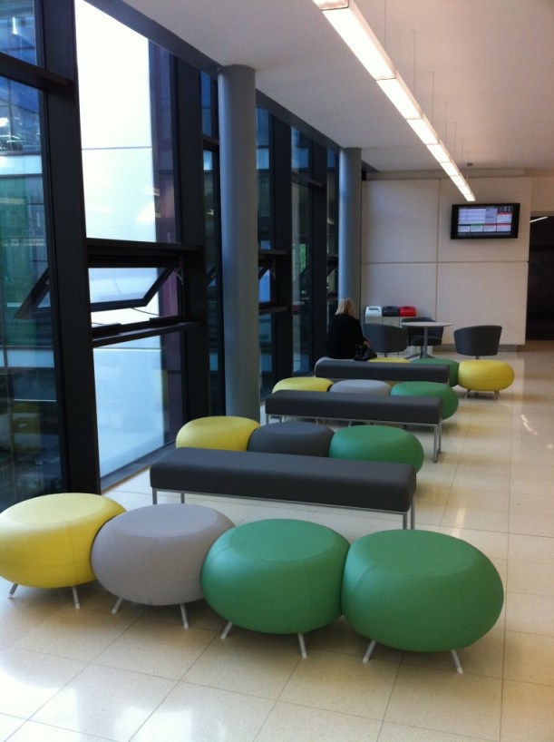 A typical area of informal seating outside the auditorium. It is always good to see areas like this, allowing for that social learning process to continue, often occuring after a lecture. I would be surprised if students didn’t move this furniture around to suit themselves.