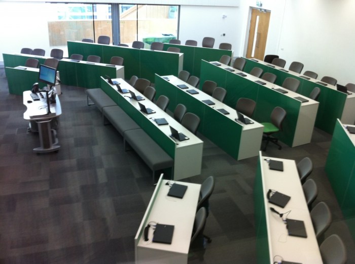 Next door is this seminar space with notebook laptops, specified ahead of the actual layout and furniture design. An interesting take on using different height desks and seating. This approach can be useful in offering choice to students although perhaps too rigid for collaborative activities.
