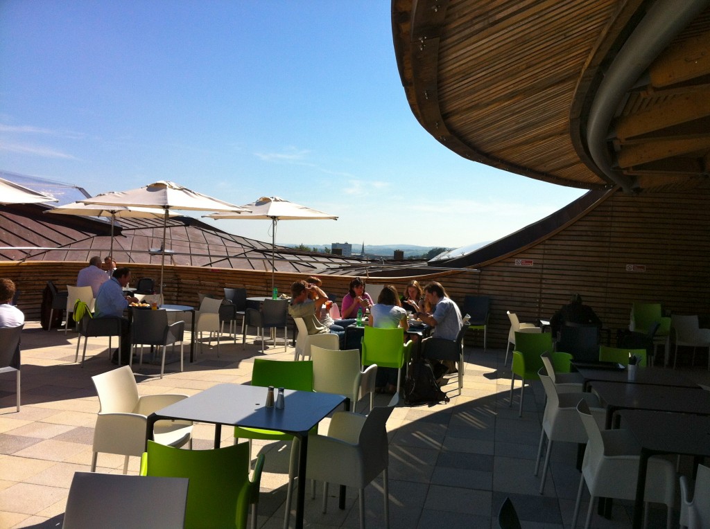 The pleasant roof terrace cafe sits within the copper roof, however, the view across the city and beyond are limited to the tallest person.