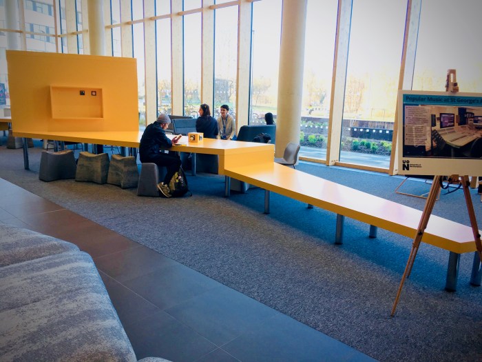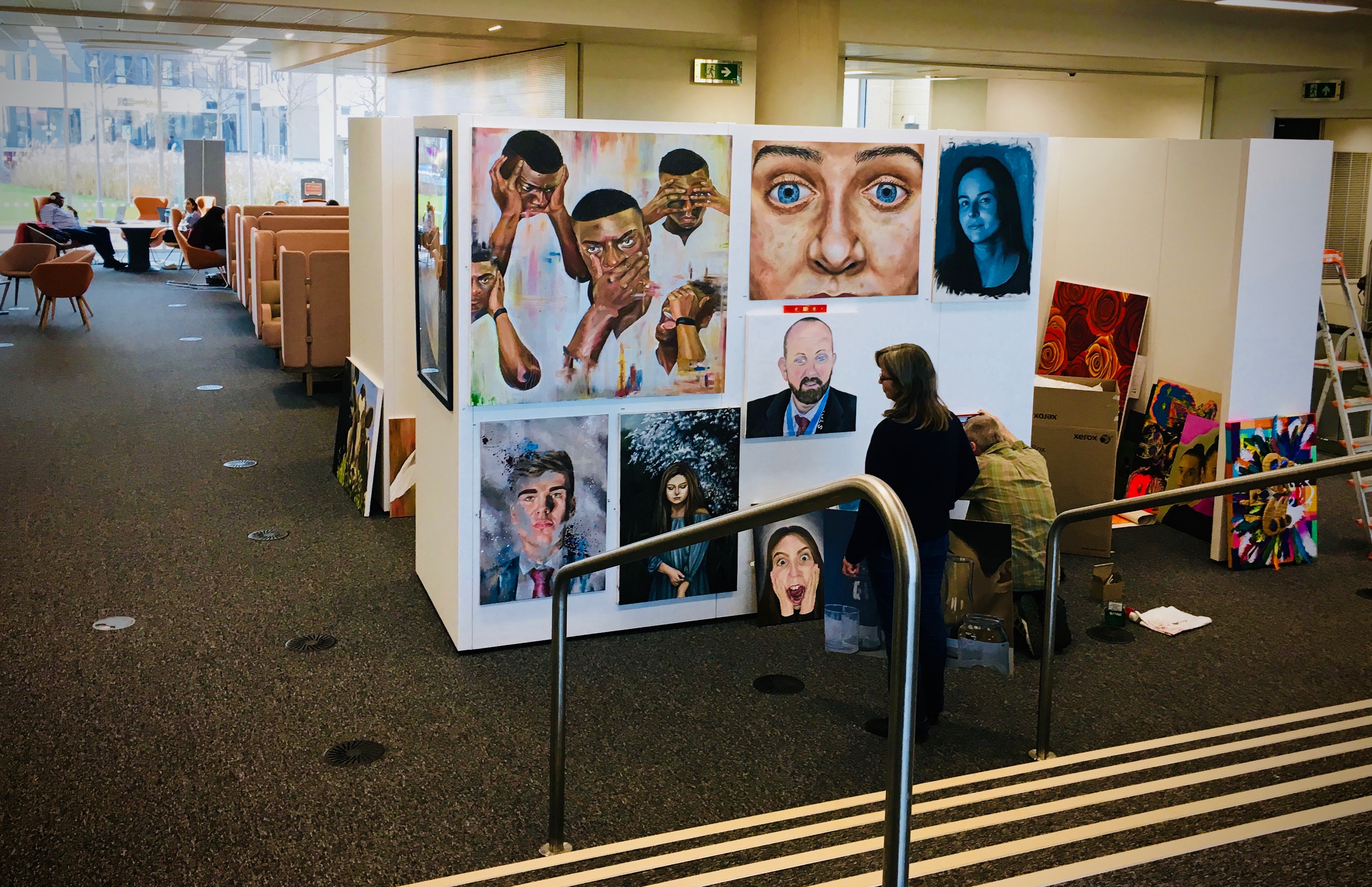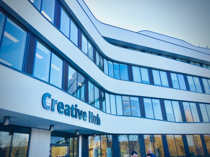 These communal spaces are collaborative zones with wireless access to the large display screens, that is also used for events and exhibitions, as you can see from this photo.