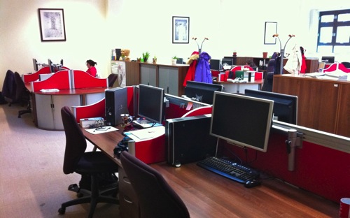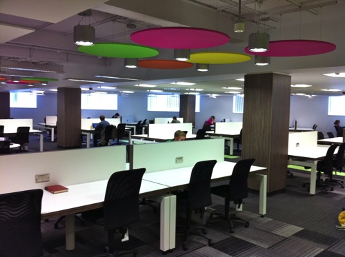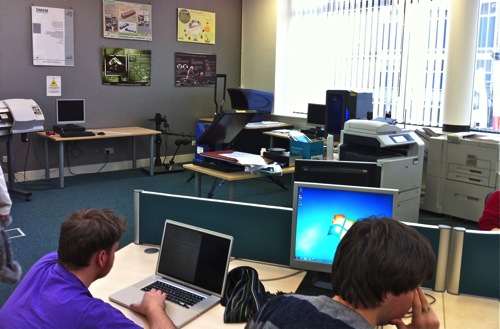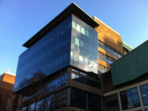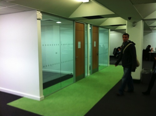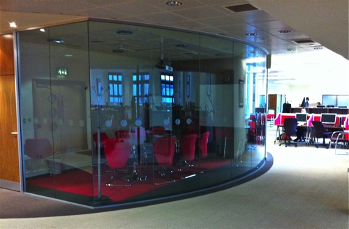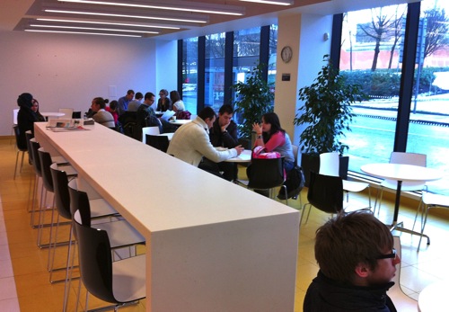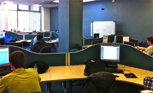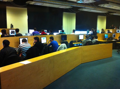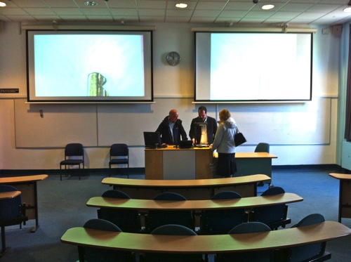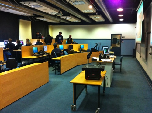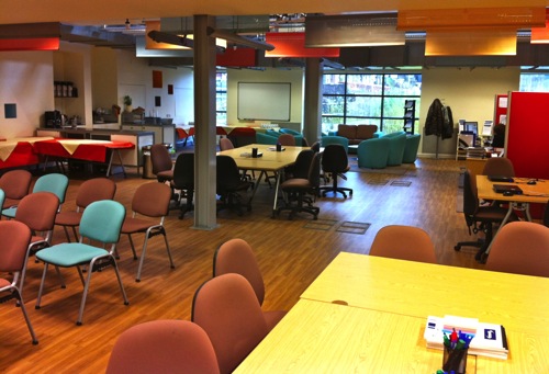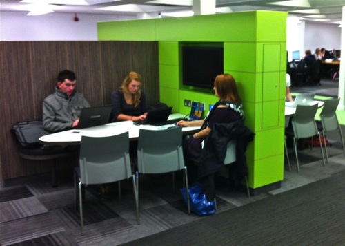 Sadly the recent fire has destroyed these rooms…but the photos show an innovative approach to seating for lectures, with the ability for students to rotate their seats to work on computers.