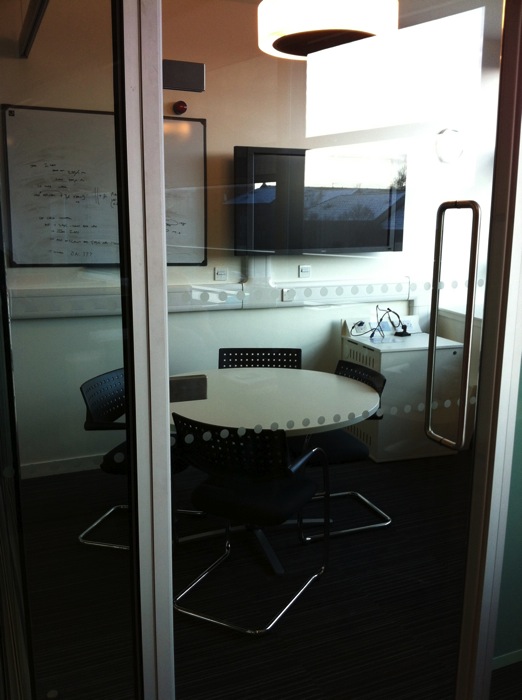 Student group study pods, some open, some in glassed rooms