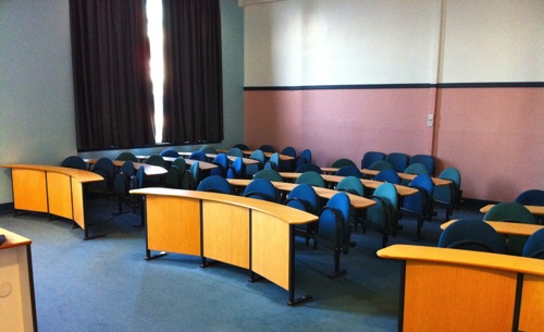 Innovative take on seating for this seminar/lecture room, an attempt to allow students to engage with each other as well as follow the lecturer