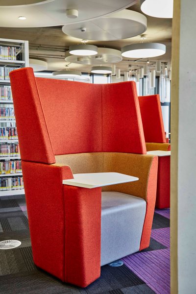 The Library overflows with contemporary spaces, colours and quality environments. There is an enormous overall improvement in the facilities for students with a sense of openness for learning in the 21st Century including versatile charging stations, cafe, silent study zones and a media room with video editing booths. The furniture was specified together with our designs realised under the highly effective account management of Lee Woodall from Broadstock.