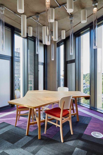This shot demonstrates the variety of furniture that we selected for the different ways that students prefer to work, as well as the open design providing access to daylight, space and interesting views of other areas on the floor.