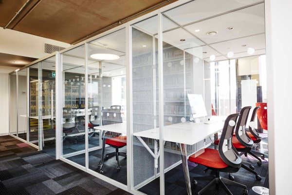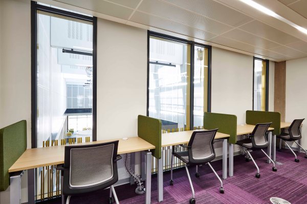 Students always need quiet study areas, these fabric screens are very useful in that they are portable, sliding onto the table quite easily. The Orangebox chairs are very comfortable for long periods of work, with a breathable back mesh and castors for movement.