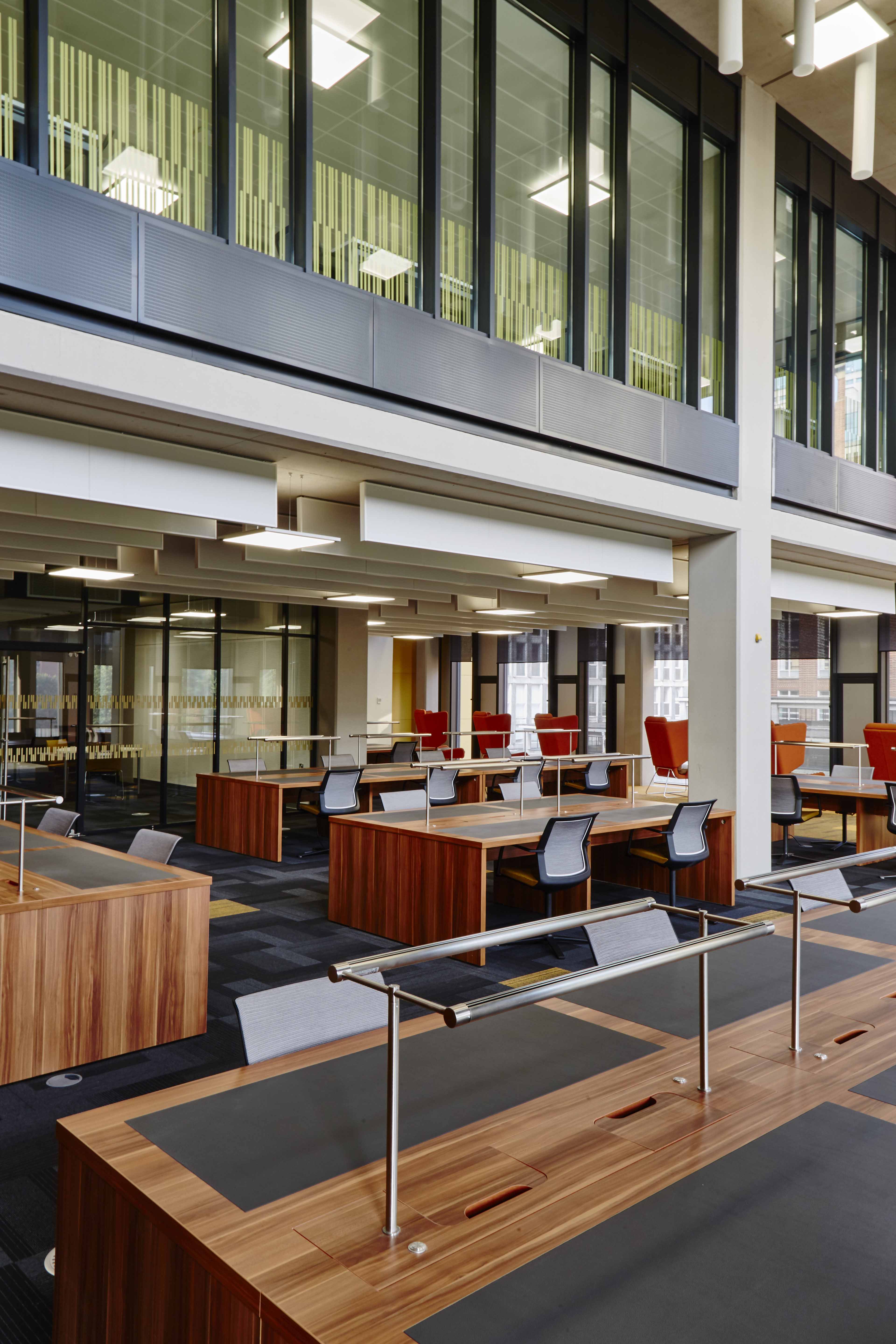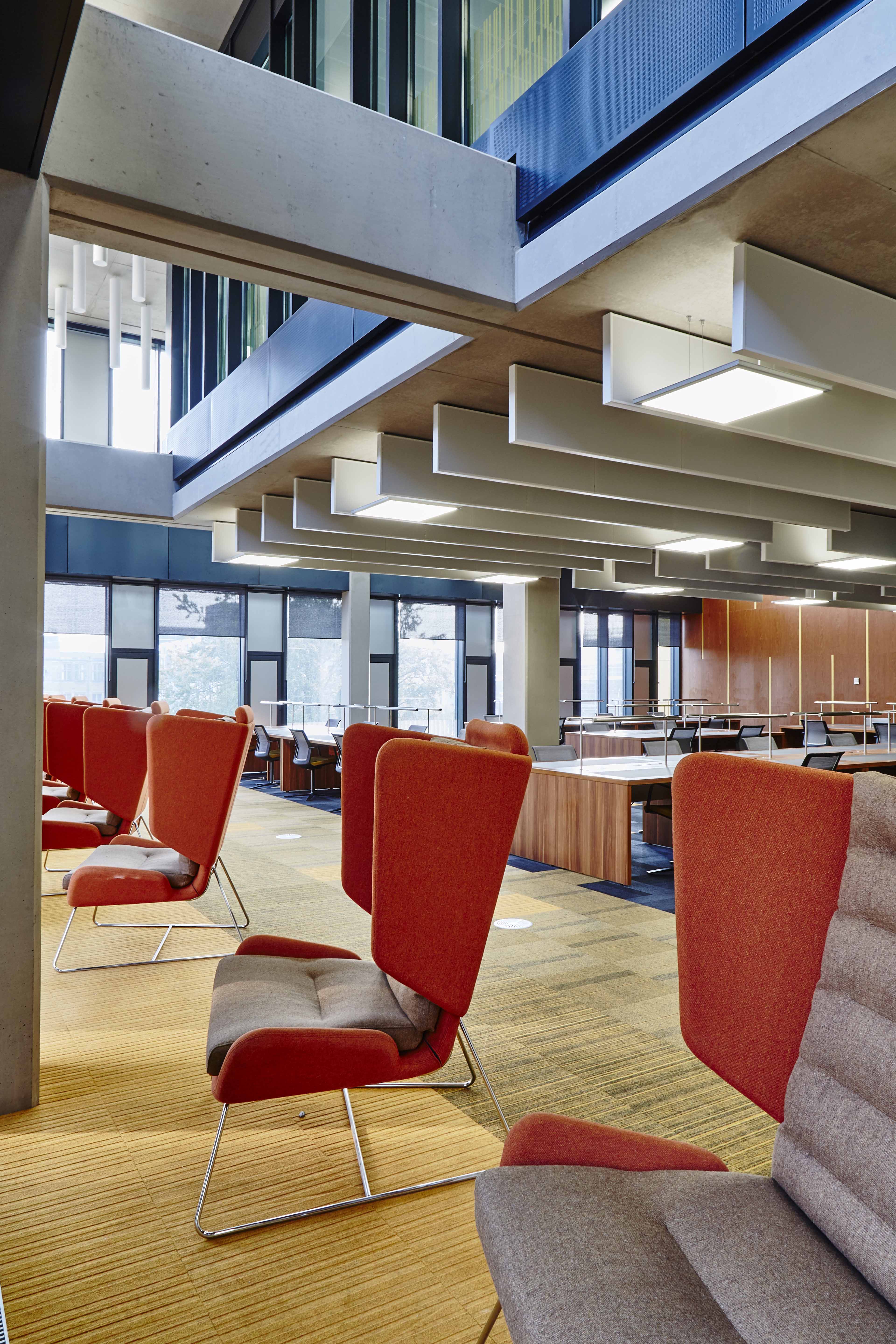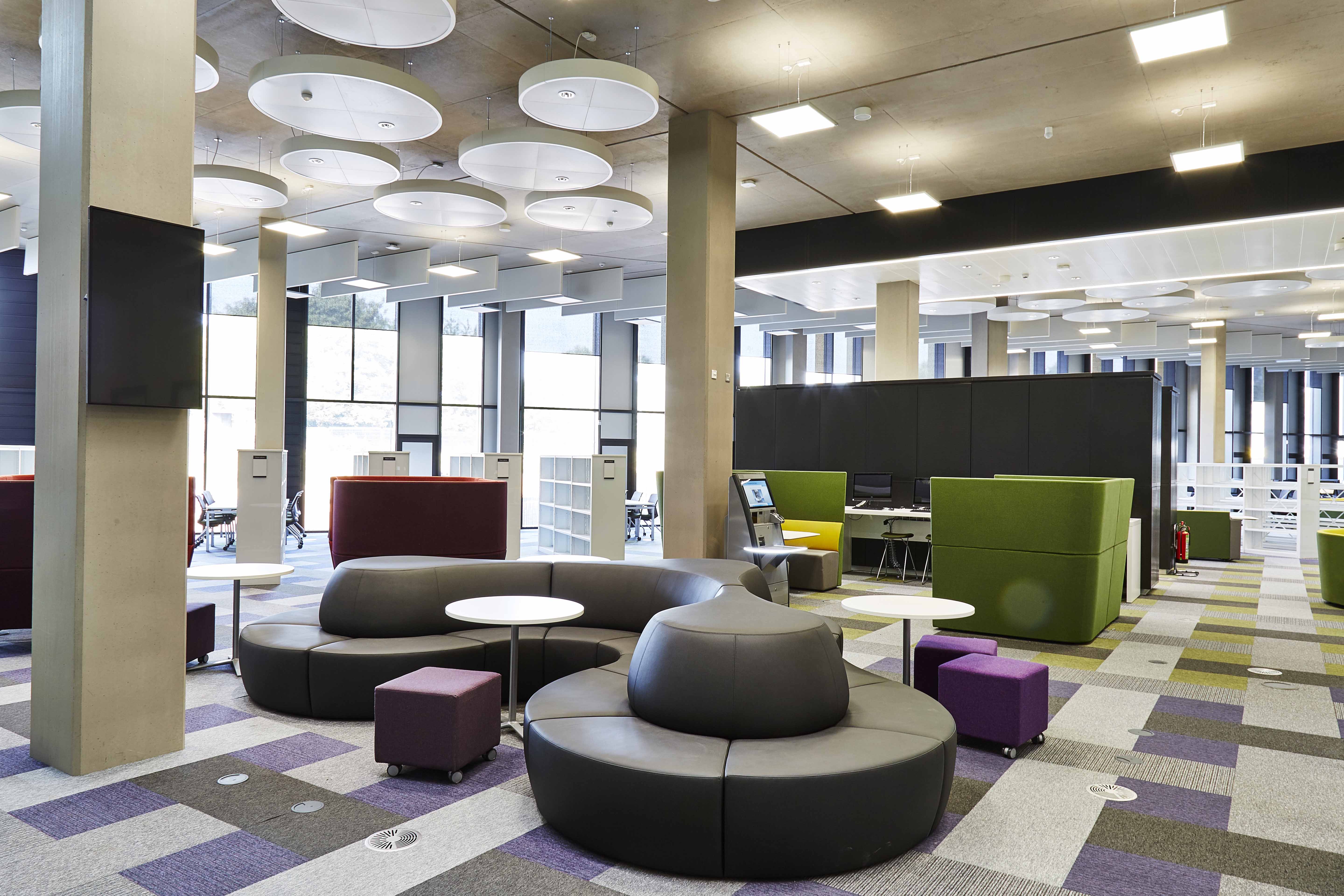 Opened in September 2016, the new library cost over £50 million and provides students with over 1,800 seats, most with power sockets. There are a variety of learning zones including casual seating, thinking spaces and individual work areas.