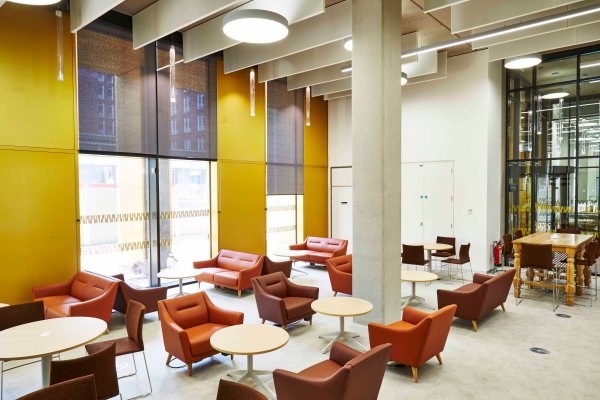 Adjacent to the Library lounge is this accessible study space that is open to all without the need to pass through the gates. A mixture of furniture pieces providing that much needed variety and enough space for different work methods.
