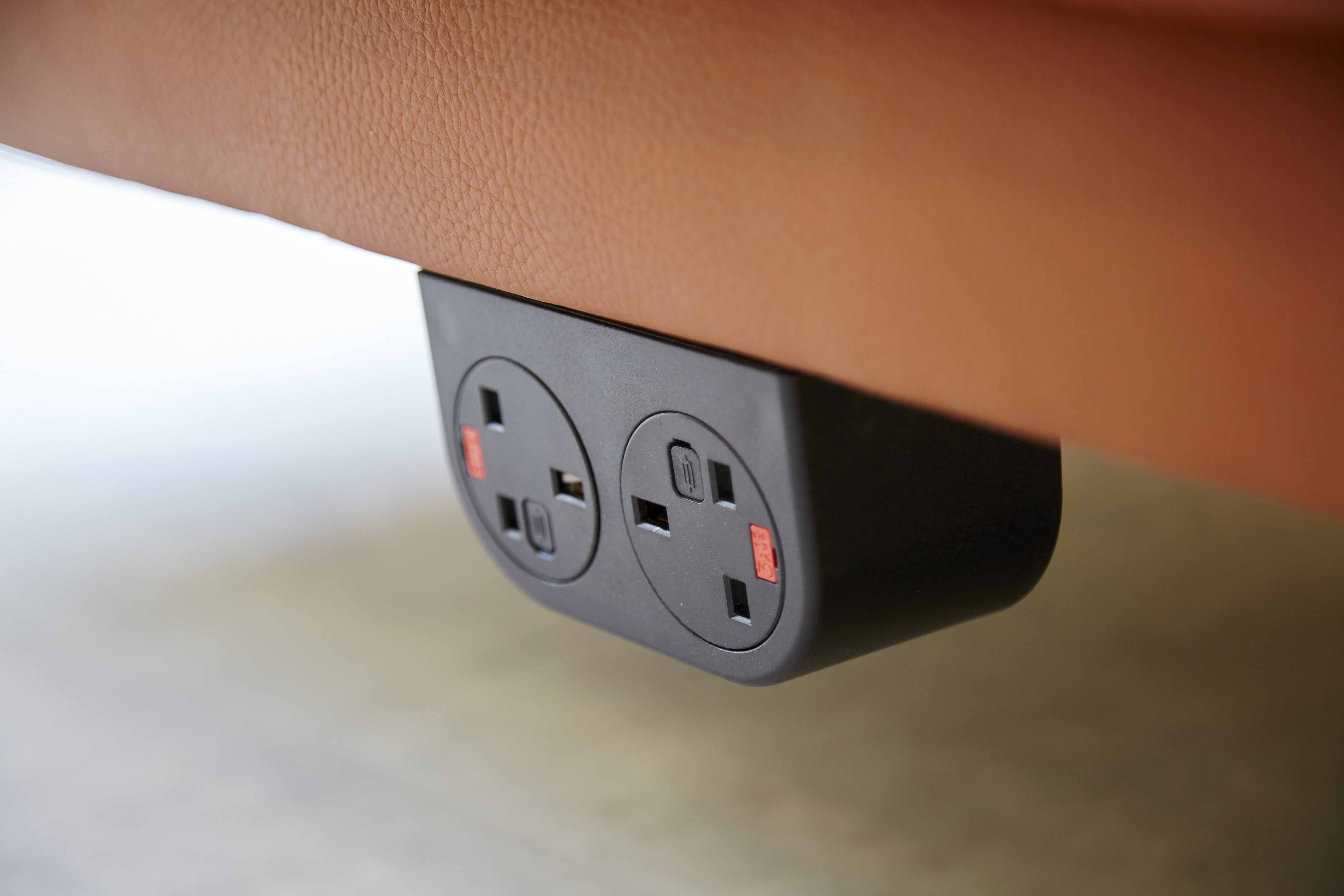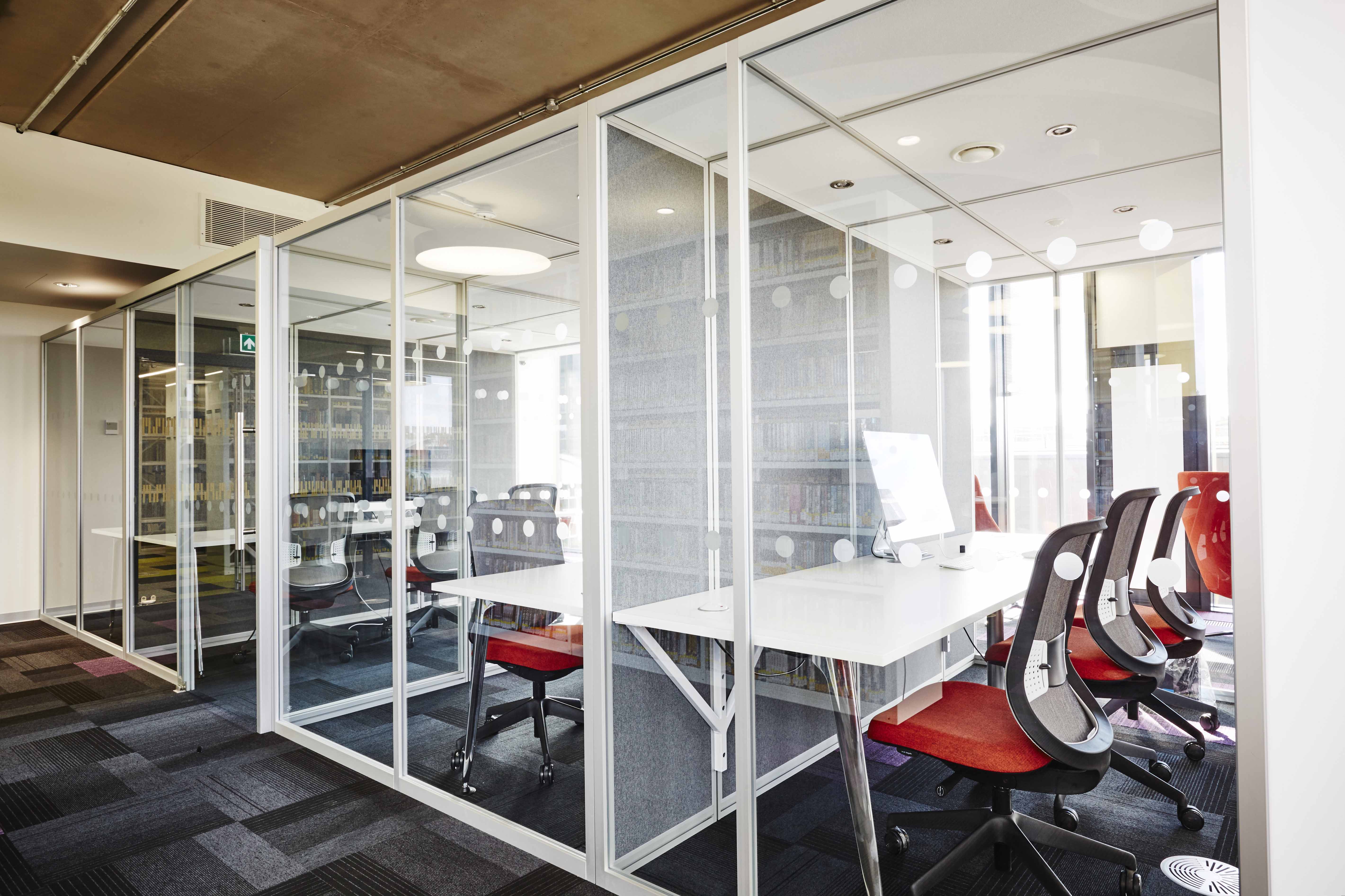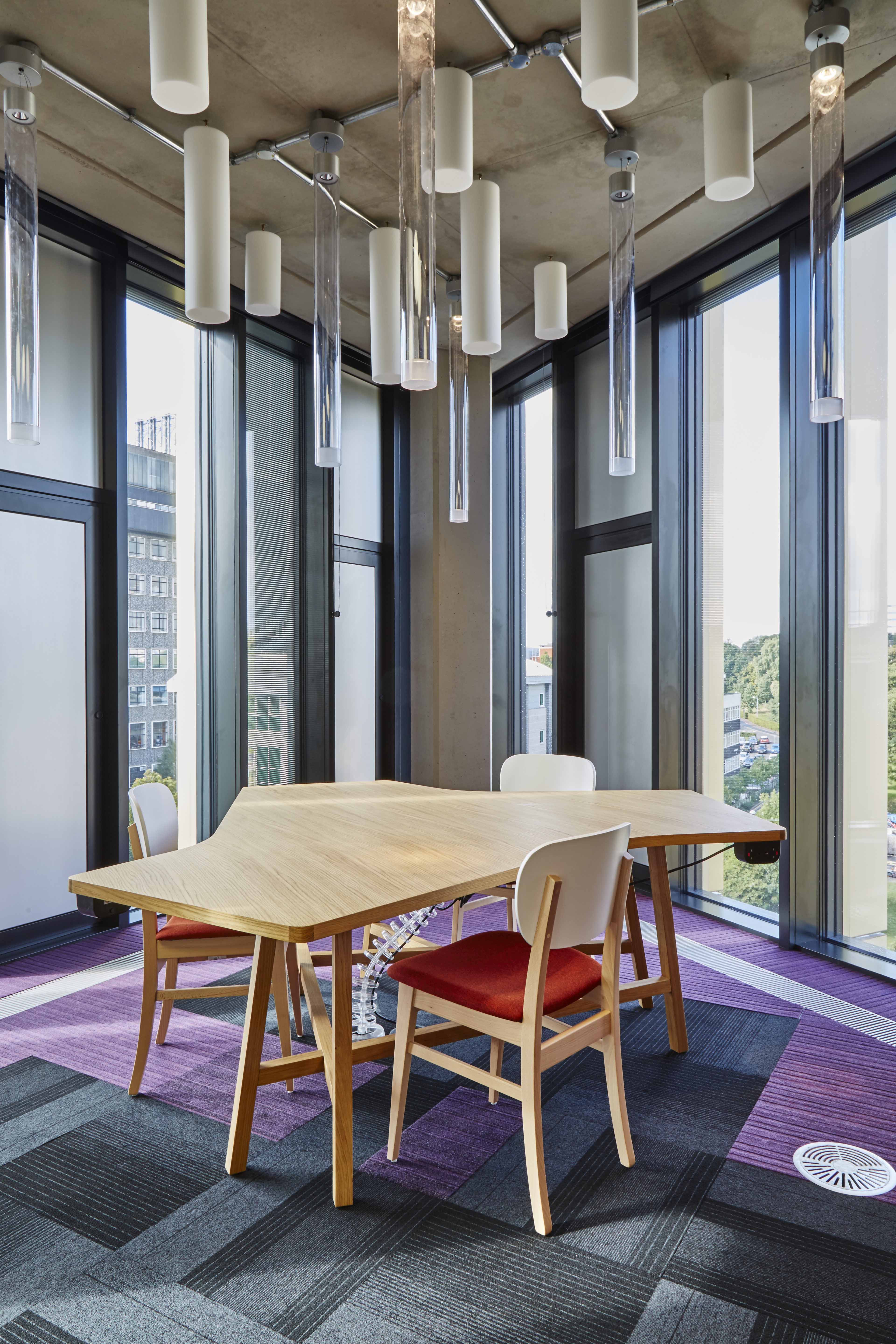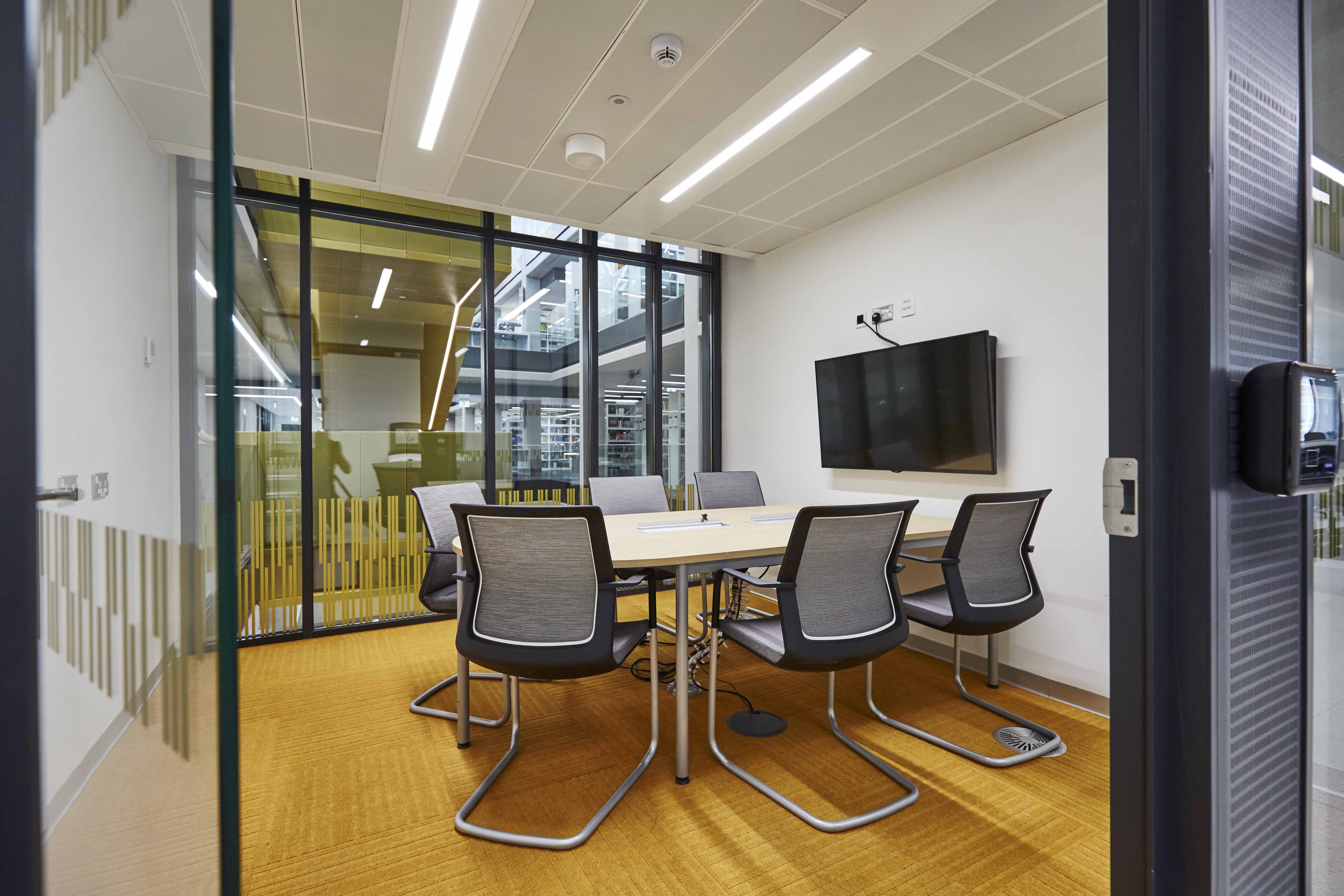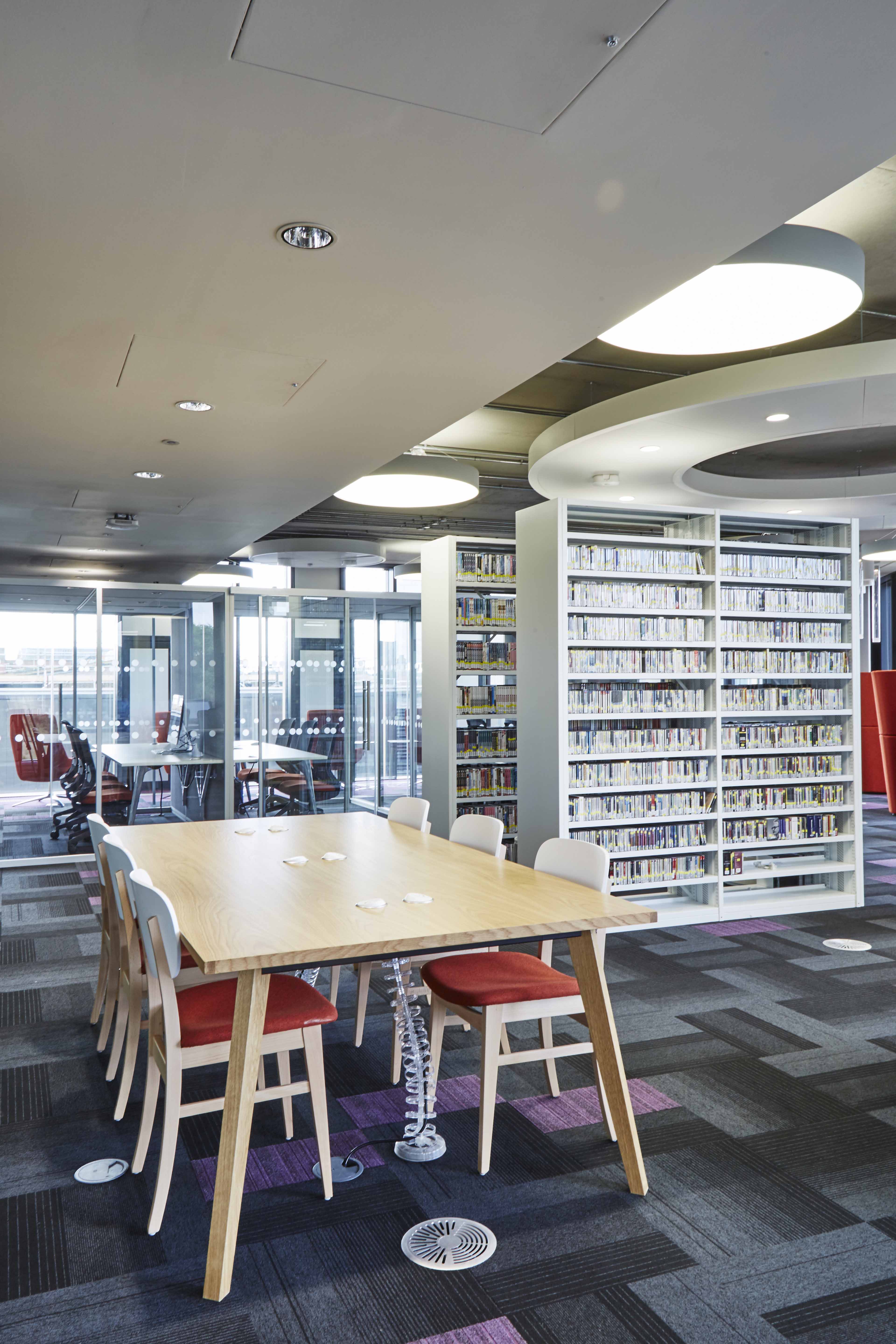 One of the many group study rooms, all bookable and fitted with LCD screens and power modules inset within the curved table
