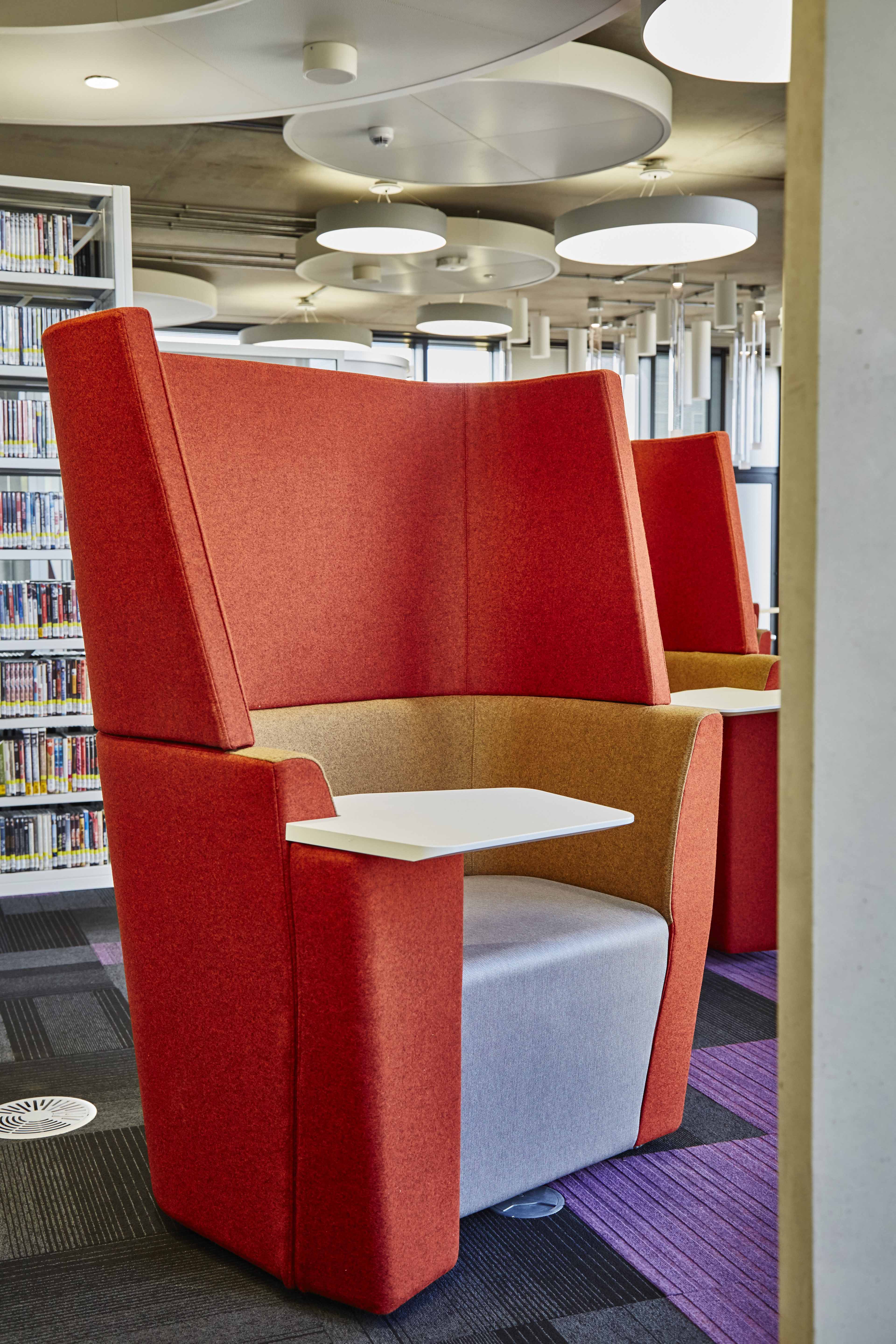 The Library overflows with contemporary spaces, colours and quality environments. There is an enormous overall improvement in the facilities for students with a sense of openness for learning in the 21st Century including versatile charging stations, cafe, silent study zones and a media room with video editing booths. The furniture was specified together with our designs realised under the highly effective account management of Lee Woodall from Broadstock.