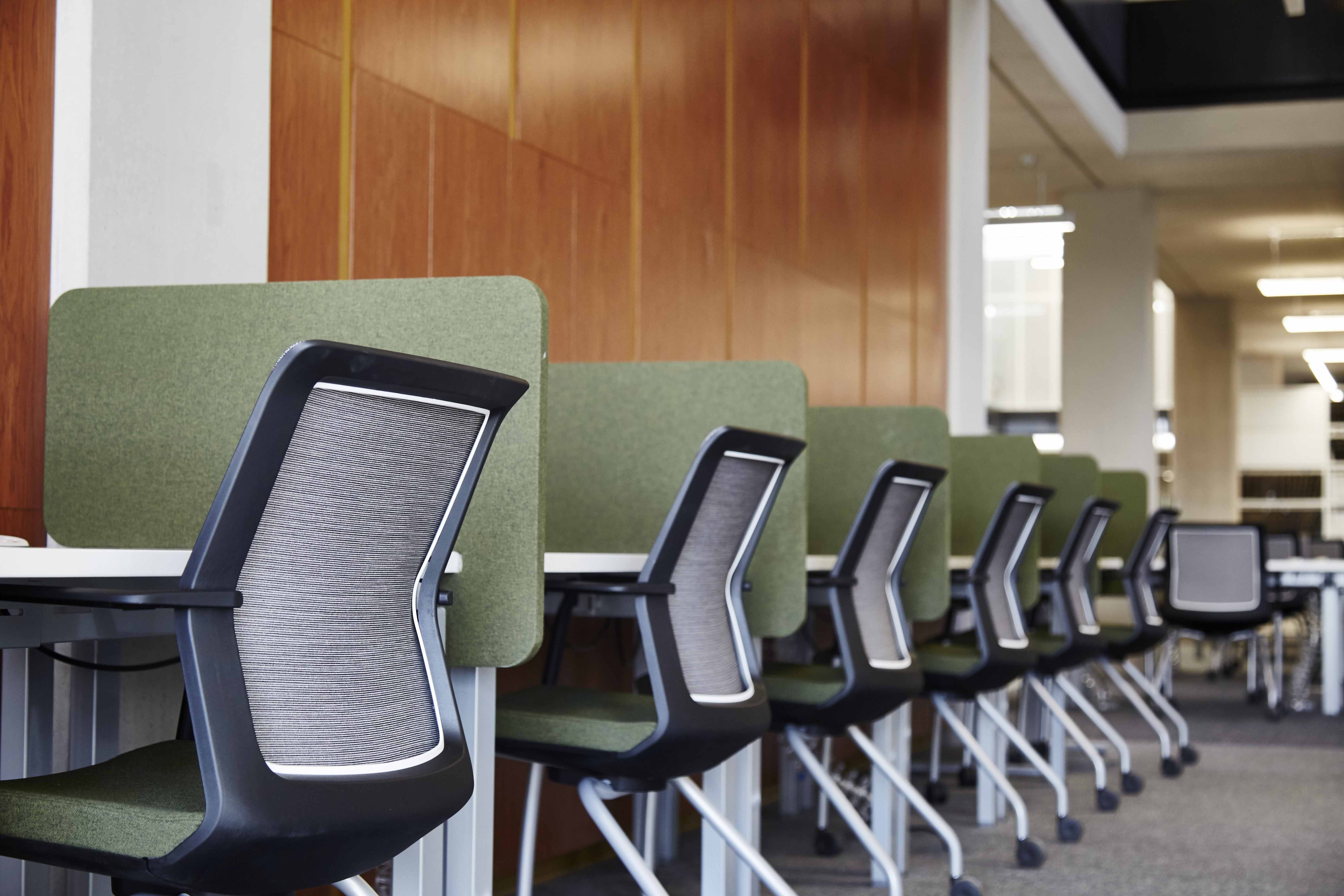 Students always need quiet study areas, these fabric screens are very useful in that they are portable, sliding onto the table quite easily. The Orangebox chairs are very comfortable for long periods of work, with a breathable back mesh and castors for movement.