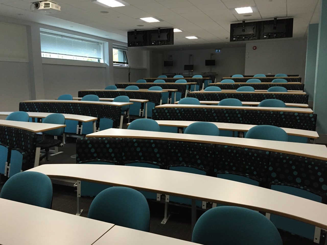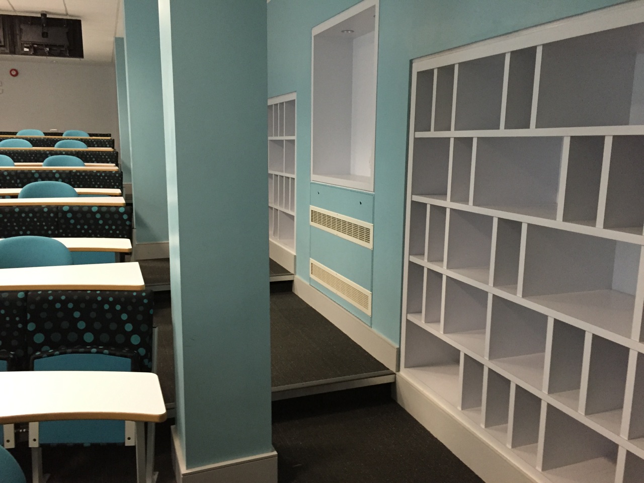 This space features the innovative ‘turn and learn’ facility of seating to allow for more interactive learning experience. The former lecture theatre has storage shelving units for bags and coats, repeater screens and iDesks at the rear.